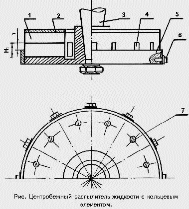 053-99 Центробежный распылитель жидкости (см.рисунок) содержит цилиндрический корпус 1 с равномерно расположенными по его периметру прямоугольными каналами 4, крышку 2, установленную на корпусе 1 при помощи винтов 7, кольцевой элемент 5, жестко закрепленный по периметру при помощи винтов 6. Корпус распылителя укреплен на валу 3, приводимом во вращение приводом (на рисунке не показан). Распылитель работает следующим образом. Центробежный распылитель получает вращение от вала. При вращении распылителя жидкость, например сгущенное молоко, перемещается тонкой пленкой по вертикальной стенке прямоугольного канала, имеющего высоту Н. Регулирование дисперсности распыления производится путем перекрытия высоты каналов. Необходимая высота канала h распылителя регулируется при помощи кольцевого элемента, жестко закрепленного по периметру корпуса винтами. Высота канала распылителя определяется вязкостью распыляемой жидкости и регулируется сменными кольцевыми элементами переменной высоты.