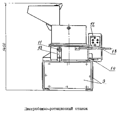 Описание В станке реализован способ объемной ротационной обработки, при котором обрабатываемые детали и гранулированный наполнитель приобретает форму тора, а интенсивный съем материала осуществляется за счет их перемешивания, соударения и относительного трения. Обработка производится в рабочей камере станка (см. рис.2) состоящей из неподвижной цилиндрической ячейки 1 и вращающегося ротора 8, которые во избежании повреждения обрабатываемых деталей футерованы резиной. Вращение ротора осуществляется асинхронным электродвигателем 3, через двухступенчатый редуктор 5. Рабочая жидкость из бака 4 подается в рабочую камеру, а затем поступает в водосборник 7, связанный с баком. Для отделения обработанных деталей от наполнителя и их выгрузки на рабочей камере смонтирован сепаратор 2, представляющий собой контейнер с ситом. Выгрузка деталей и наполнителя в сепаратор осуществляется поворотом опрокидывающейся части станка, расположенной на неподвижном каркасе 6, закрытом облицовкой 9. Поворот производится ручкой 13 относительно цапф 11, установленных в кронштейнах 10. При обработке деталей опрокидывающая часть фиксируется в вертикальном положении рукояткой 14. Управление станком осуществляется с пульта 12.