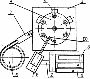 Описание Состоит из полуавтомата 1 (см. рисунок), перед которым находится стойка 2 с размещенными на ней устройством управления 3, пультом связи 4 и манипулятором 5. Слева от полуавтомата расположены вибробункер 6 и приемный лоток 7. Основными узлами устройства являются стол шестишпиндельный 8 и суппорт 9. На манипуляторе кронштейном 10 прикреплены два пневматических схвата. Стол полуавтомата вращается с остановками , перемещая обрабатываемую деталь в зону обработки. Манипулятор загружает заготовки цанги шпинделей полуавтомата и снимает обработанные детали. Ориентация и подача заготовки под схват манипулятора осуществляется вибробункером. Пульт связи соединяет технологическое оборудование с устройством управления.