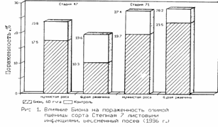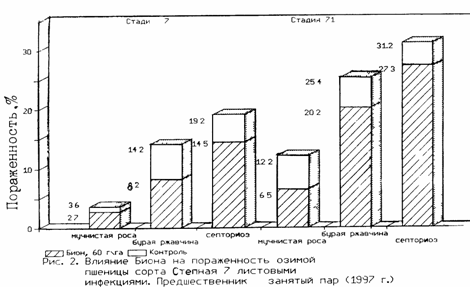 К концу вегетации болезнь нарастала по всем вариантам, однако, необходимо отметить, что в 1997г. применение Биона обеспечило достоверную защиту растений озимой пшеницы от корневых гнилей на протяжении всего вегетационного периода. Изучение действия активатора растений на устойчивость озимой пшеницы к листовым болезням проводилось в 1996-1997 гг. на сорте Степная 7 селекции Ставропольского СХИ. В течение 2-х лет мучнистая роса и бурая ржавчина ежегодно встречалась на посевах озимой пшеницы. Поскольку время появления этих болезней и пики их активности не совпадают, культура подвергается действию этих стрессов в течение длительного периода. Обработка растений Бионом на ранних стадиях развития (25-30 по Цадоксу) оказала положительное влияние на посевы озимой пшеницы, в значительной степени подавив инфекцию мучнистой росы (рис. 1 и 2), особенно при возделывании ее по занятому пару. На пшенице, идущей по пшенице (бессменный посев), болезнь появилась раньше и быстрее достигла существенного развития. Однако и в этих условиях бендикар снизил степень развития болезни в 1,4 раза. Необходимо отметить, что при различном уровне развития бурой ржавчины в посевах озимой пшеницы по различным предшественникам степень развития болезни по Биону 500 в.д.г., 60 г/га не превысила 10,3%. Таким образом, активатор растений обеспечивает достаточно эффективную защиту посевов от бурой ржавчины до фазы колошения, снижая степень развития болезни в 1,7-1,9 раз. К концу вегетационного периода наблюдалось резкое нарастание инфекции по всем вариантам. Защитное действие бендикара ослаблялось (разница в пораженности растений между контролем и Бионом составила 1,2 - 1,3 раза). Изучение развития септориоза на опытных делянках в 1997г. показало недостаточно высокую биологическую эффективность препарата в борьбе с этим вредоносным заболеванием. К моменту созревания степень развития болезни в этом варианте практически приблизилась к уровню контроля и составила 27,3% против 31,2%. Иммунизация растений Бионом 500 в.д.г. создает благоприятные условия для формирования урожая (табл. 2). Анализ его структуры показывает, что количество продуктивных стеблей на м 2 увеличилось по сравнению с контролем на 2,5 - 11,9%. Увеличились также количество и масса зерен в колосе, что в конечном итоге позволило получить более высокие урожаи. Прибавка урожая по Биону 60 г/га составила 3,9 - 4,2 ц/га зерна. Таблица 2 Влияние Биона в.г.д. на элементы структуры урожая и продуктивность озимой пшеницы