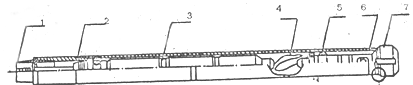 ![]() Представляет собой устройство, состоящее из отдельных стандартных геофизических приборов радиактивного каротажа и широкополосной акустики, скважинного термометра, инклинометра ИН-721 и спектрометра СЭТ-СТК, сочленяющихся между собой в определенной последовательности. Приборы помещают в контейнер 2 (см. рисунок), выполненный из двух легкосплавных бурильных труб диаметром 129 мм, соединенных между собой муфтой из немагнитной стали. Контейнер посредством специального переводника 1 соединяют с бурильным инструментом типа ЛБТ-102. Питание скважинных приборов осуществляется через специальный токоввод в переводнике, заканчивающемся кабельным наконечником - центратором 7. Центратор после сборки аппаратуры фиксируют, что исключает перемещение приборов в контейнере. Скважинные приборы внутри контейнера соединяют между собой механически накидными гайками 3, а электрически - при помощи свечных мостов и кос 4. В интервале исследований акустический прибор при подаче раствора внутрь бурильного инструмента выдвигается из контейнера. Для этого на корпусе смонтирован поршень 5, на конце прибора установлен центратор и специальное кольцо, соединяющееся с хвостовиком 6 контейнера винтами М5, у головок которых произведена проточка до 3,5 мм. Такая компоновка устраняет преждевременное выдвижение прибора на вертикальном участке ствола скважины. Управление аппаратурой осуществляют блоком коммутации, узлы которого располагают в охранном кожухе. Коммутация электрических цепей осуществляется электромагнитным переключателем. Последовательность коммутации определяется оператором в зависимости от того, каким прибором производится измерение. Аппаратура рассчитана на работу в составе серийно выпускаемых автоматических каротажных станций при гидростатическом давлении 60 МПа и температуре окружающей среды в скважине +140-1500С.