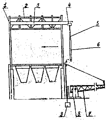 Технология монтажа заключается в следующем. До начала монтажа электродов на корпусе 1 электрофильтра (см. рисунок) возводят крышу 2 и три боковых стенки, оставив открытой одну сторону. Схема монтажа электродов электрофильтров На кровле, внутри корпуса устанавливают подвесной путь 3 из двутавра № 30 для электротельфера 4. Стенд-кантователь 7 с приводом от электрической лебедки 9 (ЛМ-1М0 устанавливают на раму 8 непосредственно у стены корпуса электрофильтра с открытой стороны. На подвесной путь заводят электротельфер с канатом 5 длиной не менее 13 м. Коронирующие и осадительные электроды подъемным краном СМК подают на стенд-кантователь, где их собирают в блоки в горизонтальном положении. Стенд-кантователь с блоками электродов лебедкой поднимают в вертикальное положение, крепят в точке «А» с помощью двух стропов и такелажных скоб и электротельфером монтируют блоки в проектное положение, исключая стенд-накопитель. |