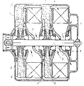Результат выполнения конструкторской разработки. Многоступенчатый центробежный компрессор содержит (см. рис.) корпус 1 с прямоугольными полостями 2, расположенные в них попарно промежуточные газоохладители 3 и установленные в корпусе 1 на валу 4 рабочие колеса 5, полость 6 нагнетания каждого из которых, кроме последнего по ходу потока, сообщена через газоохладитель 3 с полостью 7 всасывания последующего колеса 5, а в полостях 2 расположены перегородки 8, при этом рабочие колеса 5, кроме последнего, установлены на валу 4 попарно по обе стороны от газоохладителей 3 и обращены у соседних пар входами 9 навстречу друг другу, а каждая перегородка 8 уплотнена относительно вала 4 и разделяет полости 7 всасывания колес 5 соседних пар, полости 6 нагнетания колеса 5 подключены к одному из установленных попарно газоохладителей 3. Помимо этого перегородки 8, могут быть выполнены плоскими. Многоступенчатый центробежный компрессор работает следующим образом. При вращении вала 4 рабочие колеса 5 перемещают газ от входа в компрессор к выходу из него. Газ последовательно проходит через газоохладители 3. Наличие перегородок 8, разделяющих прямоугольные полости 2 с установленными в них газоохладителями 3 и полости 7 всасывания колес 5, позволяет выполнить газоохладители 3 после каждого из колес 5 одинаковыми, что уменьшает общее количество газоохладителей 3.