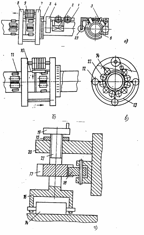 Устройство: а) - продольный вид; б) - колесо; в) - то же, вид слева; г) - поддерживающий ролик. |