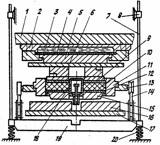 Описание Пресс-форма (см. рисунок) включает в себя корпус 11, оправку 18, верхнюю 9, нижнюю 12 и буксирную 15 плиты, а также опорные сегменты 16. Корпус пресс-формы смонтирован на тележке 13, которая может перемещать пресс-форму с позиции загрузки на рабочую позицию и позицию выталквания. Рельсы 14 для перемещения тележки закреплены на раме 19, подпружиненной относительно фундамента пружинами 20. Процесс прессования осуществляется следующим образом. Подвижная траверса 1 начинает движение вниз и передает усилие прессования через гидроподушку 2, 3, 4, качающуюся плиту 5 и пуансон 6 верхней рабочей плите пресс-формы и пакету 10. Рабочая плита начинает выполнять одностороннее прессование пакета. При этом усилие передается через тележку, рельсы опорной раме, которая, перемещаясь своими направляющими 7 во втулках 8, сжимает пружины. Сопротивление пружин постепенно возрастает, и когда усилие их сжатия превысит усилие прессования верхней плитой, с помощью буксирной плиты и сегментов, опирающихся на неподвижную траверсу пресса 17, начинается подпрессовка пакета нижней рабочей плитой. Прессование из пакетов кольцевых заготовок абразивных кругов осуществляется гидравлическим прессом усилием 6300кН.