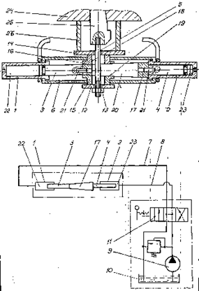Клин имеет паз 20 в средней его части и соединен посредством штифтов 21 с плунжерами и цилиндров. Рабочие полости 22 и23 цилиндров соединены трубопроводами через распределитель 11, с насосом и гидробаком.