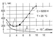 Рис. 3. Долговечность подшипников: 1 - комбинированного; 2 - качения |