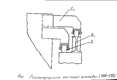 Описание Реконструкция кассетной установки СМЖ - 3302 заключается в следующем . Сдвинули стенки кассеты с размеров 120 и 160 мм, предусмотренных конструкцией установки, на размеры отсеков 60 - 80 мм. Для этого с разделительной стенки кассеты демонтировали роликоопоры. Установили (см. рис.) кронштейны 1, этих роликоопор выше по разделительной стенке на 300 - 350 мм и одновременно увеличили плечо кронштейна. Под роликоопоры подвели направляющие 2 катков. Это позволило роликоопорам 3, установленным на тепловых отсеках, сдвинуться на необходимые 60 - 80 мм размеры, т.к. роликоопора на разделительной стенке стала выше. Изменение конструкции кассетной установки позволило увеличить количество панелей. Вместо 10 по проекту, формуется 14 - 16 панелей. Расширена номенклатура изготовляемых панелей, увеличено количество отсеков для формования стеновых панелей на установке СМЖ - 3302, возросла производительность. Внедрено в СУ № 7 АО «Сахпромстрой», г.Южно-Сахалинск.