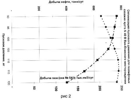Описание При реализации способа на разные моменты эксплуатации при различных значениях давления в системе газораспределения определяют: для каждой скважины зависимость дебита от расхода газа и вероятность ее запуска; для каждого из источников подачи газа - значение расхода газа подаваемого в систему, ранжируют скважины и источники подачи газа в порядке влияния на их показатели давления в системе газораспределения, определяют оптимальное значение пускового и рабочего давлений для отдельных скважин и в зависимости от значения последних с учетом существующих ограничений, изменяют давление в системе газораспределения путем установки новых режимов технологических объектов (газлифтных скважин и источников подачи газа), уточняют параметры, определяют степень влияния давления в подсистеме газораспределения, производят перераспределение (группировку) технологических объектов по степени влияния и повторяют процедуру работы газлифтного комплекса. Оптимальные значения рабочего и пускового давления для каждой скважины определяют по заданному забойному давлению и (или) по заданному давлению на выходе источника подачи газа, сумме необходимых и достаточных для транспортирования, регулирования и запуска перепадов давлений в подсистеме газораспределения. Каждая группа (все, часть, одна) скважин может иметь свои оптимальные значения пускового и рабочего давлений, которые поддерживают в одно и то же время или изменяют в разное время или по мере изменения геолого-технических и технологических параметров скважин. Каждую группу скважин могут оснащать разными подсистемами газораспределения, связанными с отдельными источниками подачи газа или общей подсистемой газораспределения, которую питает один или разные источники подачи газа в разное или в одно и то же время. В качестве источника подачи газа могут использовать газовые скважины и (или) компрессорные станции с разными или равными значениями давлений на выходе. При определения необходимого и достаточного перепада давления для запуска скважины равного сумме сбросов давлений на каждом клапане, расход газа изменяют порциями с одновременной регистрацией его давления во времени. Подбор скважинных камер производят на основе минимального давления в подсистеме газораспределения за определенное время эксплуатации газлифтного комплекса, а газлифтные клапаны выбирают на основе текущего давления в подсистеме газораспределения.