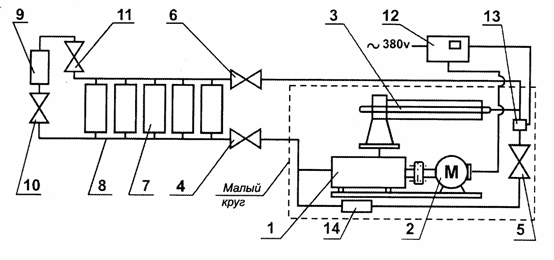 Разработан тепловой генератор, в основе конструкции которого применен струйный аппарат, преобразующий энергию движущейся жидкости в тепловую, используемую для обогрева в заданных диапазонах температур жилых, производственных и складских помещений, а также теплиц и других зданий и сооружений сельскохозяйственного назначения. Теплогенератор (рис. 1) состоит из фланца 1, корпуса 3, крышки 4 и трубы 5. В зависимости от площади обогреваемого помещения разработаны 4 типоразмера теплогенератора, способных обогреть от 3 до 45 комнат площадью 16 м 2. Выделение тепловой энергии происходит за счет сложных процессов циркуляции жидкости и возникновения кавитационных процессов в корпусе и трубе. Вода в конус 2 подается насосом под давлением 4-5 атмосфер. Нагретая жидкость поступает либо непосредственно к радиаторам, либо в резервуар, выполняющий роль аккумулятора горячей жидкости, а затем - в радиаторы. При подаче горячей жидкости в помещения высотных зданий рекомендуется использовать подкачивающий насос малой мощности. На рисунке 2 приведена схема системы отопления, которая рекомендуется для зданий незначительной высотности. Система состоит из насоса 1, приводимого в действие от электродвигателя 2;теплогенератора 3;кранов 4, 5, 6, 10 и 11;радиаторов 7;трубопровода 8;расширительного бачка 9;автомата управления 12;датчика температуры 13 и фильтра 14. Работа приведенной системы осуществляется в 2 этапа:сначала жидкость прогревается до заданной температуры,циркулируя по малому кругу, а после этого включается большой круг, т.е. все радиаторы. В системе отопления рекомендуется использовать радиаторы (конвекторы) объемом 1-3 л. Эффективность работы теплогенератора в районах с холодным климатом может быть существенно выше, если обернуть утеплительными чехлами элементы системы, обеспечивающие работу по малому кругу циркуляции. Отопительная система работает следующим образом. Проводится опрессовка системы под давлением в 1,5 раза выше рабочего. Расширительный бачок и система заполняются профильтрованной жидкостью, открываются все краны и система прокачивается с целью удаления воздуха. Затем закрывают краны 4, 6, 11 и включают электродвигатель. На табло автомата управления 12 устанавливают желательный диапазон изменения температур. Достижение максимальной температуры свидетельствует о готовности к включению всех радиаторов. Для этого открывают краны 4 и 6, не выключая электродвигателя, и горячая вода начинает циркулировать по большому кругу. При достижении максимальной температуры автомат управления отключает электродвигатель и начинается цикл охлаждения. Когда температура в системе снизится до заданной минимальной, автомат включает электродвигатель. Разработана также схема отопления для зданий большой этажности. Генератор тепла является достаточно простым в конструктивном исполнении и экологически чистым источником тепла, требует минимальных трудозатрат в эксплуатации.