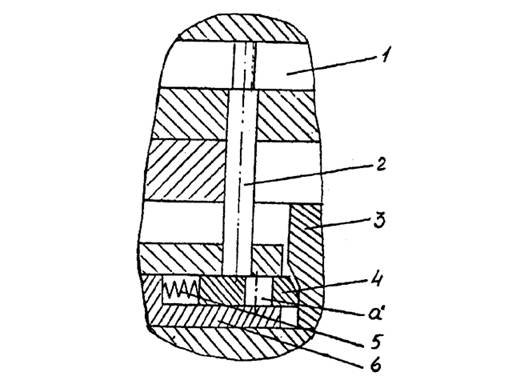 Описание Результат выполнения конструкторской разработки. Устройство состоит из стержня 2 (см.рисунок), закрепленного в плите съема 1, бруса 3 с наклонным участком, ползуна 4, подпружиненного пружиной 5, расположенного в плите 6 выталкивания. В начале хода съема деталей плита выталкивания начинает перемещаться вместе со стержнем, упирающимся в подпружиненный ползун, приводя в движение плиту съема. При дальнейшем перемещении плиты выталкивания ползун своим скосом взаимодействует с наклонным участком бруса и перемещается, сжимая пружину. При совпадении отверстия «а» в ползуне со стержнем последний беспрепятственно проходит в это отверстие и останавливается вместе с плитой съема.
