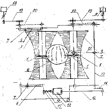 Описание Результат выполнения технологической разработки. Машина для очистки коры с плодов бахчевых культур является результатом конструкторской разработки. Состоит из рамы 1 (см. рисунок) сварной конструкции, на которой смонтированы две пары горизонтально расположенных щеточных барабанов 2, 3, 4. Нижние барабаны 4 расположены перпендикулярно верхним 2, 3. Каждый из барабанов представляет собой цилиндр, на наружной части которого закреплены щетки, причем иглы щеток имеют разную длину, которая увеличивается от середины к краям. По центру барабанов на подшипниках установлены игольчатые диски 5, обеспечивающие поворот плода 16 в процессе его очистки. Барабан 2 закреплен на рычагах 6 и удерживается в верхнем положении пружинами 7. Барабан 3 имеет игольчатый диск с приводом от электродвигателя 9 посредством приводного вала 10, клиноременной 19 и цепных передач 20, 21, а также звездочек 8, 3. Привод барабанов осуществляется от электродвигателей 9, 18 с помощью клиноременных 19 и цепных 20 передач. Машина имеет автоматическое устройство, обеспечивающее перемещение плода 16 с верхних барабанов на нижние в зависимости от времени очистки плода от коры. Автоматическое устройство включает кривошипы 11, шатун 12, компенсатор 13, тягу 14 с защелкой 15. Машина работает следующим образом. Плоды подаются сверху по одному дозирующим устройством и попадают на верхние щеточные барабаны 2, 3. Как только плод делает один оборот кривошип 11 через шатун 12, компенсатор 13 и тягу 14 отпирает защелку 15. Барабан 2 опустится под действием веса плода вниз и плод 16 упадет на нижнюю пару щеточных барабанов 4. Пружины 7 возвращают барабан 2 в исходное положение, и он фиксируется защелкой 15, возвращаемой в исходное положение пружиной 17. На верхние барабаны подается новый плод. Нижние барабаны 4 устроены также как и верхние и работают аналогичным образом. Плод обрабатывается по окружности в двух взаимно перпендикулярных направлениях. Это обеспечивает полное удаление коры со всего плода бахчевых культур. Равномерная и качественная очистка плода осуществляется за счет ударно-счесывающего воздействия на его кору. Скорость перемещения плодов по вертикальной оси сверху вниз регулируется изменением длины кривошипа. Пружины 7 имеют регулировку по весу плода. Производительность машины зависит от сорта и размеров очищаемой культуры.