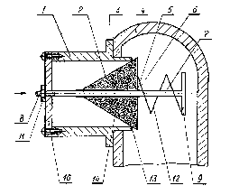 Описание Данный материал является результатом технологической разработки ВГАУ, кафедры "Тракторы и автомобили". Усовершенствованная впускная система двигателя содержит впускной коллектор 4 (см. рисунок) с патрубком 1 и фланцем 3 для крепления воздухоочистителя. На торце последнего закреплена планка 10 и постоянно замкнутый запорный клапан 2, выполненный в виде перфорированного конуса с вершиной, направленной в сторону патрубка. Клапан крепится втулкой 6 на стержне 7 с возможностью осевого перемещения. С одной стороны стержень снабжен упором 9 и пружиной 12, размещенной между упором и основанием 5 конуса клапана и удерживающей клапан в постоянно замкнутом состоянии, а с другой стороны он заканчивается резьбой 8 с фиксирующей гайкой 11. Внутренняя полость клапана заполнена воздухопроницаемым термостойким материалом 14 - металлической путанкой. При работе двигателя на разных режимах воздушный поток, сжимая пружину, открывает клапан и воздух через образовавшийся зазор 13 поступает во впускной коллектор. При появлении во впускном коллекторе обратной вспышки от двигателя клапан под действием потока газа и пружины перекрывает проходное сечение патрубка. Перфорированный корпус клапана и термостойкий материал в нем препятствуют распространению фронта пламени к воздухоочистителю, задерживают продукты сгорания и пропускают очищенный газ через патрубок и воздухоочиститель в атмосферу. Перфорация на корпусе клапана и металлическая путанка снижают силу газов, действующую на клапан при его закрытии, что способствует облегчению его управлением. При поступлении воздуха в цилиндры двигателя воздушный поток, воздействуя на клапан, очищает его от продуктов сгорания, то есть постоянно происходит его самоочищение.