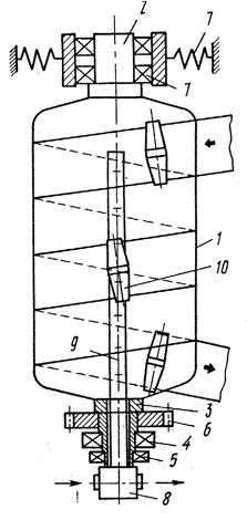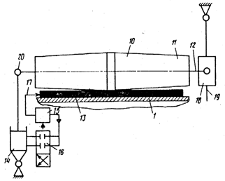 Результат выполнения конструкторской разработки. Устройство для контактной сушки длинномерных материалов содержит сушильный цилиндр 1 (см.рис.1), верхнюю и нижнюю опоры с цапфами 2 и 3, подшипники качения 4 и 5, передаточный элемент 6, упругие элементы 7, торцевое уплотнение 8, перфорированную трубу 9, транспортирующий орган 10, выполненный в виде пары усеченных конусов 11 (см.рис.2), сопряженных большими основаниями, транспортирующий орган 10 установлен на оси 12 и снабжен устройством, контролирующим положение материала 13, состоящим из привода 14, пневмораспределительных элементов 15 и 16, контролирующий элемент 17, ползун 18, установленный на кулисе 19, привод 14 подключен к оси 12 транспортирующего органа 10 посредством шарнира 20. Устройство работает следующим образом. Поступающий на рабочую поверхность сушильного цилиндра 1 длинномерный материал 13 с относительной влажностью 90% набегает под углом 15°по отношению к оси его вращения, направляется транспортирующими органами 10 и перемещается по спиралевидной траектории, контактируя с горячей поверхностью цилиндра 1, закрепленного на цапфах 2 и 3, установленных в опорах качения так, что при возникновении поперечных возмущенных сил (центробежных неуравновеншенных, колебании величины натяжения полотна) верхняя опора, имеющая упругие элементы 7, совершает гармонические затухающие колебания (благодаря чему рассеивается кинетическая энергия, а конструкция изолируется от вредных воздействий динамических нагрузок), относительно нижней опоры. Обогрев рабочей поверхности цилиндра 1 обеспечивается циркулирующим теплоносителем через нижнюю полую цапфу 3 посредством уплотнения 8 и перфорированной трубы 9, равномерно распределяющей теплоносителем внутри обечайки по ее высоте через отверстия с переменным шагом и сечениями. Скапливающийся в нижнем днище конденсат отводится через кольцевое отверстие в цапфе 3 благодаря перепаду давления внутри обечайки и конденсатной линии, что исключает возможность растекания конденсата в виде кольца по внутренней поверхности рабочей греющей части цилиндра 1, снижающего нагрузку на опоры. Перемещающийся по спиралевидной траектории «кромка - к кромке» материал 13 центрируется в зонах набегания и сбегания, а также на каждом витке траектории движения материала 13 транспортирующими органами 10 (см.рис1., рис.2). При совмещении средней линии движущегося материала 13 со средней линией спиралевидной траектории силовое взаимодействие транспортирующего органа 10 с цилиндром 1 происходит по максимальному диаметру без наличия осевых центрирующих сил. В случае смещения средней линии материала 13 относительно средней линии траектории происходит изменение положения контролирующего элемента 17, взаимодействующего с кромкой материала 13 и регулирующего подачу сжатого воздуха через пневмораспределительные элементы 15, 16 и привода 14, изменяющего положение транспортирующего органа 10, создающего требуемое направление и величину осевой центрирующей силы при взаимодействии конусных поверхностей транспортирующего органа 10 с поверхностью материала 13 на цилиндре 1, а также с ползуном 18, установленным на кулисе 19. Для тканей бытового ассортимента желательна усадка и следует использовать схему заправки материала 13 «снизу - вверх», а для тканей технического назначения - «сверху - в