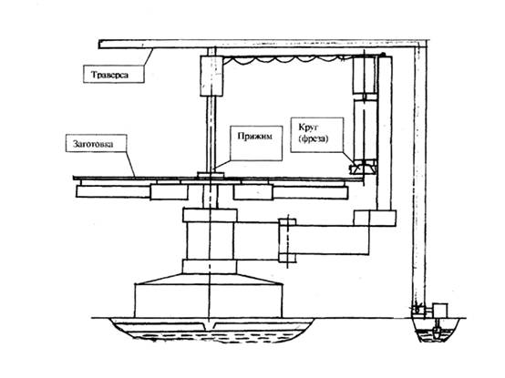 Описание Результат выполнения конструкторской разработки. Станок (см.рисунок) включает в себя: основание, стол, прижим с заготовкой, абразивный круг (фреза), траверса. При обработке кромок мебельных стекол использован принцип механического копирования. Обрабатываемую заготовку устанавливают сверху на копир, закрепленный на столе, и фиксируют на нем прижимом. Абразивный круг, установленный под нужным углом к плоскости стекла, подводится к его кромке и врезается на нужную величину. Величина определяется настройкой следящего механизма, механически взаимодействующего с копиром. Стол приводится во вращение, и осуществляется автоматическая обработка кромки стекла по всему периметру. Следящий механизм обеспечивает постоянное усилие прижима круга к стеклу и угол наклона профиля к плоскости стекла по всему периметру. В отдельных случаях возможен обход контура обрабатываемой заготовки вращением консоли с инструментом вокруг неподвижной заготовки. Управление станком предельно упрощено, переналадка на другую конфигурацию обрабатываемой детали сводится к замене копира. Изменение угла и катета фаски кромки легко достигается с помощью одного и того же механизма. Станок имеет широкие технологические возможности в плане изменения режимов обработки, использования различных режущих инструментов, в т.ч. алмазных кругов, поэтому позволяет вести различную обработку от грубого фрезерования и шлифования до тонкого окончательного шлифования и полирования. Кроме стекла возможна обработка пластиков, дерева, фанеры, металлических листовых заготовок с применением соответствующего инструмента.