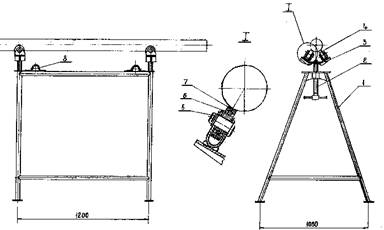 Описание Результат выполнения конструкторской разработки. Рольганг состоит из подставки 1, сваренной из труб, винтов 2, предназначенных для регулирования заданной высоты при установке изделий на машину. На конце винтов свободно вращается вокруг своей оси каретка 3 с подшипниковыми узлами 4, состоящими из радиальных подшипников 6, вращающихся на оси 5. Для предохранения поверхности изделия от повреждений при проведении сборочных работ на наружный диаметр кольца подшипника напрессовывается кольцо 7 из мягкого цветного металла. Для строповки и перемещения рольганга в верхней части подставки приварены две дуги 8. Применение рольганга-подставки позволяет сократить время на установку изделий при сборочных работах, улучшить условия труда и техники безопасности.