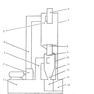 Описание Результат выполнения конструкторской разработки Состоит (см. рисунок) из пылеприемного зонта 1, вентилятора 2, вихревого аппарата 7, цилиндрического циклона 10, дополнительного 13 и основного 14 бункеров сбора пыли. Устройство для сухого пылеулавливания работает следующим образом. Воздушно-пылевой поток с полидисперсной пылью из полости пылеприемного зонта 1 поступает по входному патрубку 3 в цилиндрический циклон 10, в котором поток раскручивается за счет тангенциального ввода и крупные фракции пыли оседают по стенам циклона в дополнительный бункер сбора пыли 13. Дополнительный бункер прикреплен к нижней части корпуса циклона. Закрученный воздушно-пылевой поток с тонкодисперсной пылью через выходной патрубок 9, совмещенный с входным патрубком 8, поступает в корпус вихревого аппарата 7. Взаимодействуя с атмосферным воздухом от вентилятора 2 спутно закрученным тангенциальным патрубком 4, в верхней части корпуса вихревого аппарата получается дополнительное ускорение вращения и охлаждение воздушно-пылевого потока. Это снижает вязкость и несущую способность потока, способствует конденсации влаги на частицах пыли и облегчает их сепарацию центробежными силами из высокотемпературного потока на стенки корпуса вихревого аппарата. Сепарированная тонкодисперсная пыль по патрубку 11 поступает в бункер сбора пыли 14, а очищенный воздух через выходной патрубок 6 выбрасывается в атмосферу. Предварительная очистка воздушно-пылевого потока от крупных частиц пыли повышает улавливающую способность вихревого аппарата на 15-20%, а исключение подачи атмосферного воздуха во входной патрубок вихревого аппарата снижает общую воздушно-пылевую нагрузку на вихревой аппарат и уменьшает металлоемкость устройства. Ликвидируется забивание первичного ввода дисперсным материалом при работе на переменных режимах. Устройство для сухого пылеулавливания при термическом бурении.