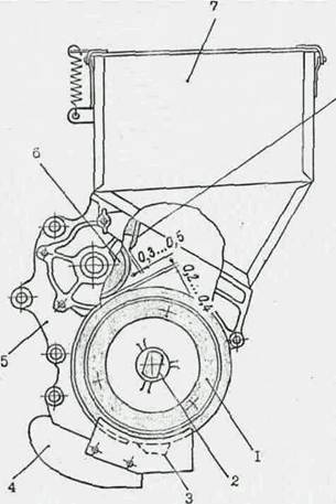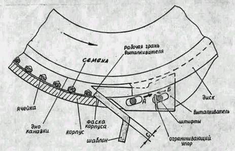 У высевающих аппаратов сеялок ССТ-12Б и ССТ-12В расстояние С (рис. 2) между рабочей гранью выталкивателя и фаской корпуса различно и зачастую значительно больше размера высеваемых семян. Поэтому крупные семена фракции удаляются из ячеек рабочей гранью выталкивателя, а мелкие раньше - при подходе к фаске корпуса. Если после крупного семени высевается мелкое, то интервал между семенами в бороздке уменьшается. Напротив, если после мелкого в бороздку попадает крупное семя, интервал между семенами увеличивается. В результате существенно снижается равномерность распределения семян в рядке. С применением модернизированного выталкивателя посредством подгиба ограничивающего упора устанавливается величина С равная 4 мм, одинаковая для всех высевающих аппаратов. Величину С регулируют при снятом ячеистом диске с помощью шаблона в виде металлического стержня круглого сечения диаметром 4,1 мм. Шаблон устанавливают, как показано на рис. 2, и подгибают ограничивающий упор до соприкосновения фаски корпуса с рабочей гранью выталкивателя. Ограничивающий упор подгибают по стрелке А для уменьшения расстояния С и по стрелке Б для увеличения С. Рис.1. Высевающий аппарат свекловичной сеялки: i - ячеистый диск, 2 - ось вращения ступицы ячеистого диска, 3 - выталкиватель семян, 4 - сошник, 5 - корпус, 6 - роли отражатель, 7 - бункер для семян, 8 - чистик. • Рис.2. Удаление семян из ячеек высевающего аппарата свекловичной сеялки. |