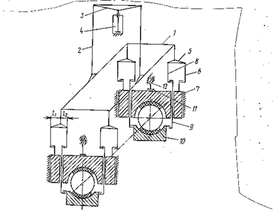 Результат выполнения конструкторской разработки. Относится к обработке металлов давлением, более конкретно к прокатным станам, и может быть использовано в рабочих клетях обжимных и заготовочных станов горячей прокатки. Устройство (см. рисунок) содержит траверсу 1, связанную при помощи тяг 2 и коромысла 3 с цилиндром 4. На концах траверсы шарнирно закреплены четыре двуплечих рычага 5. Каждый из рычагов одним концом соединен шарнирно с тягой 6 подушки 7, а другим концом через промежуточную тягу 8 посредством Г-образных подхватов соединен с соответствующей тягой 9 бугеля 10, при этом отношение плеч рычага 5 i1 qb + qб --- = ----------------- , i2 qп + qнв где qВ масса валка; qб масса бугеля; qп масса подушки; qнв масса нажимного винта и его подпятника. Подушки опираются через подпятники 11 на нажимные винты 12. Устройство работает следующим образом. При вращении нажимных винтов подушки и бугели вместе с валком перемещаются синхронно поступательному движению винта за счет подвески их через систему тяг 2, 6, 8 и 9, рычагов и коромысла и противодавления в цилиндре, при этом обеспечивается выборка зазоров соответственно между валком и подушками, между подушкой и подпятником, а также между винтом и его гайкой. За счет независимой подвески бугелей и подушек к траверсе через двуплечие рычаги с упомянутым выше соотношением их плеч между валком и соответственно подушками и бугелями поддерживается автоматически минимальный уровень давления на их вкладыши. При перевалке валков вращением нажимных винтов подушки с бугелями и валком опускаются и устанавливаются с помощью протавок на подушки нижнего валка, сбросом давления в цилиндре траверса дополнительно опускается на некоторую величину и между Г-образными подхватами тяг 6 и 8 и соответственно подушек и тяг образуется зазор для свободного вывода валка и подушек с бугелями (совместно с комплектом нижнего валка) из окна станины рабочей клетки. Заводка нового комплекта валков осуществляется в обратном порядке. Обеспечивается постоянное по величине усилия поджатия вкладышей подушки к шейке валка в процессе эксплуатации. В результате за счет воздействия предлагаемой схемы уравновешивания через тяги и двуплечие рычаги осуществляется постоянное и минимально допустимое по величине поджатие к шейке валка к вкладышам подушек. Наличие промежуточной тяги упрощает перевалку валков. Внедрено на АООТ "Уральский завод тяжелого машиностроения". |