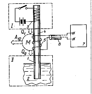 Описание 01 Результат выполнения научно-исследовательской работы. Способ предназначен для измерения отрицательной абсолютной температуры, определяемой как параметр в распределении Больцмана, оптически активной среды лазера или мазера с тепловым возбуждением. Способ может быть использован в квантовой теплофизике, квантовой электронике, оптике. Суть предлагаемого способа состоит в следующем. Заметим, что оптически активная среда образуется частицами (ядрами, атомами, молекулами), обладающими квантуемыми степенями свободы. Взаимодействуя через эти степени свободы, частицы образуют макроскопические квантовые системы (МКС). Возбуждение МКС трехуровневого теплового лазера (мазера) происходит в результате двух последовательных тепловых контактов этой системы с нагревателем с температурой Т1 и холодильником с температурой Т2 (Т1, > Т2, > 0). В результате в МКС устанавливается инверсное (обращенное) распределение частиц по энергетическим уровням, описываемое отрицательной абсолютной температурой Т3. Значение температур Т1 и Т2 измеряется любым способом, доступным для данного диапазона температур, например, с помощью платинового термометра сопротивления. Величина температуры Т3, определяется из формулы Т3 = Т2/(1-((v13/v21)*((t1-t2)/t1))), где v13 - частота кванта теплового излучения, фотона, поглощение которого частицей оптически активной среды переводит ее на верхний энергетический уровень, v21 - частота лазерного перехода (частота генерируемого электромагнитного излучения). Если температура верхнего источника теплоты t1 является величиной фиксированной, то процедура измерения t3 сводится к измерению температуры нижнего резервуара t2. При фиксированном значении Т2 измеряемой величиной оказывается температура нагревателя t1. Рассмотрим пример реализации предлагаемого способа. Тепловой трехуровневый мазер (Е.О. schulz-du-bois, h.e. scovil, патент США № 3015072, приоритет от 26.12.1961) осуществляет прямое преобразование энергии тепловых колебаний в энергию когерентного электромагнитного излучения. Он состоит из цилиндрического стерня 1 (рис.1), погруженного одним концом в жидкий гелий 2, охлажденный до температуры Т2= 1,5 Кельвина. Температура верхнего конца стержня с помощью электронагревателя поддерживается на уровне t1 = 20 Кельвинов. Стержень является одноосным монокри-сталлом корунда (А1203) с присадкой хрома. Парамагнитные ионы хрома cr 3+ распределены не по всему объему стержня, а лишь в его средней части 4 с концентрацией 0,05 %. Имея электронный спин 3/2, ионы хрома образуют спин систему (МКС) из трех энергетических уровней, пригодную во внешнем перпендикулярно ориентированном по отношению к оси кристалла магнитном поле напряженностью 2 кэ и при температуре t2= 1,5 Кельвина для осуществления генерации микроволнового электромагнитного излучения с частотой v21=1420 Мгц. С помощью индукционной катушки 5 и коаксиального кабеля 6 осуществляется вывод генерируемого электромагнитного излучения или связь теплового мазера, работающего в режиме усилителя, с генератором 7 этого типа излучения. Описанное устройство осуществляет преобразование взятой из резервуара i при температуре t1 тепловой энергии q1, в квантовомеханическую работу. В резервуар ii при температуре t2 (к нижнему концу стержня) передается тепловая энергия q2. Квантовомеханическая работа А12 = q1 - q2 затрачивается на