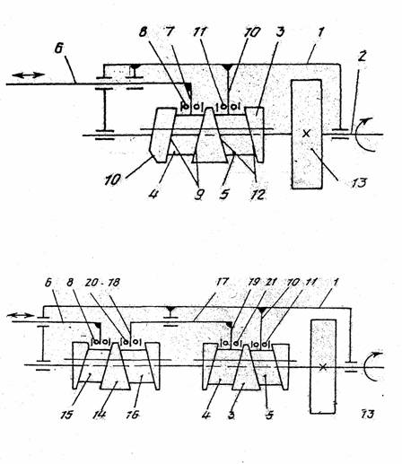 Устройство может быть снабжено дополнительными втулками 14 каждая с двумя канавками 15, 16, наклоненными к оси втулки навстречу друг другу, и промежуточными штоками 17 с двумя поводками 18, 19, предназначенными для взаимодействия через подшипники 20, 21с канавками 16 и 4 соседних втулок 14 и 3. Устройство работает следующим образом. При повороте ведущего вала 2 и вместе с ним втулку 3 подшипник 11, связанный через поводок 10 с корпусом 1, сдвигает втулку 3 вдоль оси вала 2, воздействуя на боковые стенки 12 канавки 5. Одновременно боковые стенки 9 второй канавки 4 воздействуют через подшипник 8 с поводком 7 на шток 6, сдвигают его относительно корпуса. В результате шток перемещается на суммарную величину подъемов двух кольцевых канавок 4 и 5. При дальнейшем повороте ведущего вала 2 шток аналогично перемещается в обратную сторону на двойную величину подъемов кольцевых канавок. Маховик 13 обеспечивает плавность вращения вала 2. Применение в устройстве дополнительных втулок с промежуточными штоками 17 позволяет увеличить ход штока 6 в два и более раз (в зависимости от количества втулок 14). Форма канавок 4. 5 и 15, 16 на участке подачи подшипников 8, 11 и 20, 21 влево (по чертежу) может отличаться от формы этих канавок на участке подачи подшипников вправо, что может обеспечить различные временные и фазовые характеристики перемещения штока 6 в прямом и обратном направлении (например, медленный ход штока 6 влево и быстрый ход штока 6 вправо). |