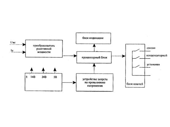 Описание Результат выполнения конструкторской разработки. Блок-схема регулятора включает преобразователь реактивной мощности (см.рисунок), блок индикации, процессорный блок, устройство запрета по превышению напряжения, блок ключей. На входы преобразователя реактивной мощности подается линейное напряжение сети и ток нагрузки от вторичной обмотки трансформатора тока. При этом ток и напряжение выбирают таким образом, чтобы между ними был угол фазового сдвига 90 о. Получаемое на выходе преобразователя напряжение, пропорциональное реактивной мощности, подается на процессорный блок. Подключение секций конденсаторной установки осуществляется подачей команды от процессорного блока на блок ключей и сопровождается включением соответствующих индикаторов блока индикации. Устройство запрета по превышению напряжения вырабатывает запрет включения секций конденсаторной установки при напряжении, превышающем установленное значение и индикацию превышения напряжения. Процессорный блок осуществляет самонастройку регулятора реактивной мощности путем последовательного подключения секций конденсаторной установки, измерения мощностей секций и хранение в памяти измеренных значений. В процессе регулирования реактивной мощности процессорный блок измеряет значение реактивной мощности и один раз в две минуты выдает команду на подключение секций конденсаторной установки, обеспечивающих максимальную компенсацию Принцип регулирования реактивной мощности - поддержание минимально возможного потребления реактивной мощности из сети.