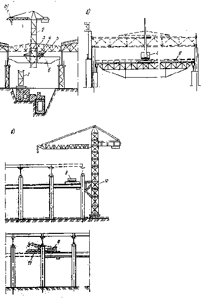 Варианты использования мостовых кранов для монтажно-демонтажных работ Применение мосто-стреловых кранов позволяет решить вопросы, связанные с необходимостью замены покрытий реконструируемых цехов как при демонтаже старых, так и при монтаже новых. Монтаж конструкций покрытия может быть осуществлен и гусеничным краном типа МКГ-25БР, установленным на самоходный мост, передвигающийся по ранее смонтированным подкрановым балкам. Мост выполнен из двух ферм пролетом 34 м с расстоянием между ними 3,6 м высотой 2,2 м и перемещался в процессе работы ходовыми приводными тележками. Технология монтажа конструкций покрытия предусматривала погрузку на самоходный мостстропильных ферм и комплект конструкций на один шаг покрытия (12 м) и установка этих конструкций в проектное положение гусеничным краном (рис. б). Возможен также монтаж покрытия переоборудованным башенным краном жестко сочлененного с цеховым мостовым краном и перемещающимся по одной нитке рельсового пути (рис. в). Собственно мостовые краны можно с успехом использовать для механизации работ по заменен и рихтовки подкрановых балок и рельсов. Для этого их оснащают поворотной стрелой, прикрепленной к главной балке или установленной на грузовой тележке крана. Анализ условий проведения монтажных работ при реконструкции предприятий и оценке опробированной в производственных условиях технологии по использованию средств механизации позволяет сделать вывод о целесообразности применения стреловых грузоподъемных механизмов в сочетании с оборудованием цехов. Это позволяет практически не останавливая производства, выполнять реконструкцию цехов, Что способствует значительному сокращению материально-технических затрат по сравнению с традиционным решением. |