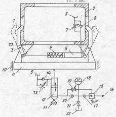 Описание Частное техническое решение, имеющее самостоятельное значение. Опорное устройство для стрелы крана содержит захватные рычаги 1 (см. рис.) для стрелы 2, закрепленные в средней части посредством шарниров 3 на опорной плите 4. Свободные концы рычагов соединены друг с другом посредством демпфера, выполненного в виде гидроцилиндра 5, в штоковой полости которого установлена возвратная пружина 6, а поршневая полость через дроссель 7 и обратный клапан 8 соединена с гидробаком 9. С боковых сторон плиты 4 установлены направляющие 10, закрепленные на основании 11.Плита установлена на основании с помощью демпфера, выполненного в виде гидроцилиндра 12, штоковая полость которого через дроссель 13 и обратный клапан 14 сообщена с гидробаком 9. Напорная магистраль15 через регулируемый клапан 16, обратный клапан 17 подключена к гидроаккумулятору 18, сообщенному через параллельно включенные регулируемый дроссель 19 и обратный клапан 20 с поршневой полостью гидроцилиндра 12. Гидроаккумулятор 18 через вентиль 21 сообщен со сливным баком 22. Рычаг 1 выполнен с упорами 23 для стрелы. При больших скоростях двигателя автомобильного крана стрела совершает колебания, которые гасятся с помощью демпферов. При вибрации рычагов 1 и повороте их относительно шарниров 3 жидкость в гидроцилиндре 5 периодически вытесняется через дроссель 7 в гидробак 9 и возвращается обратно через клапан 8. Вертикальная вибрация стрелы передается на плиту 4 и гасится с помощью гидроцилиндра 12. Жидкость из штоковой полости гидроцилиндра периодически вытесняется через дроссель 13 в бак 9 и возвращается обратно через клапан 14. Также происходит обмен жидкостью между поршневой полостью гидроцилиндра 12 и гидроаккумулятором 18 через дроссель 19 и клапан 20. Гидроаккумулятор 18 заряжается от напорной магистрали 15. Жидкость может быть слита из гидроаккумулятора 18 с помощью вентиля 21.
