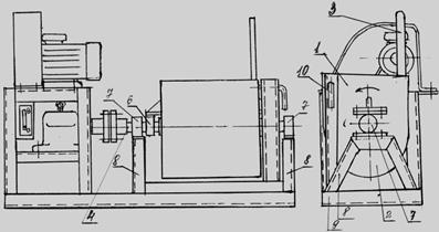 Бетоносмеситель состоит из корпуса, выполненного в виде прямоугольного короба 1 с полуцилиндрической нижней частью 2 короб 1 установлен на валу 4 с лопастями 5 на четырех подшипниках, два из которых жестко прикреплены к коробу 1, а два жестко прикреплены к стойкам 8. Стойки 8 прикреплены к раме 9 и одна из них снабжена стопором 10. Стопором 10 короб 1 фиксируется в вертикальном положении. При включении электродвигателя вал 4 с лопастями 5 приводится во вращение и производится загрузка короб 1 компонентами, составляющими бетонную смесь. По истечении времени, необходимого для приготовления смеси, электродвигатель выключается, вал останавливается короб 1 расфиксируется стопором 10 и рукояткой 3, закрепленной на задней стенке короба 1, опрокидывается в горизонтальное положение и вновь фиксируется в этом положении стопором 10. Затем вал 4 снова приводится во вращение и бетонная смесь лопастями выталкивается из короба 1. |