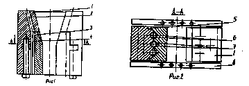 Описание Результат выполнения конструкторской разработки. Кристаллизатор (см. рис. 1 и 2) состоит из стенок 1 с верхним расширенным под углом к вертикали и вертикальным нижним участком с наклонным водоохлаждающим каналом 2, съемных накладок 3, вертикальных каналов 4, выступов накладок 5, цилиндрических канавок 6 с выборками 7, вертикальных стенок 8. В процессе работы кристаллизатора вертикальные стенки 8 совершают возвратно-поступательное движение, а стенки 1 - вращательное движение с обжатием заливаемого металла и выталкиванием его в нижнюю часть кристаллизатора. При охлаждении стенок 1 вода поступает в наклонные каналы 2, а из них - в вертикальные каналы 4, образованные цилиндрическими канавками 6 с выборками 7 в накладке 3 и в самой стенке 1. При омывании водой поверхности наклонных каналов и цилиндрических канавок с выборками происходит эффективное охлаждение стенок и соприкасающегося с ними металла.