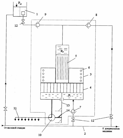 Описание Частное техническое решение, имеющее самостоятельное значение. Разработан гидроподкормщик дождевальной машины мультипликаторного типа, в работе которого используется энергия поливной воды из напорного трубопровода, что позволяет вносить жидкие удобрения одновременно с поливной водой из закрытой оросительной сети. Гидроподкормщик мультипликаторного типа устанавливается перед гидрантом напорного трубопровода (см.рисунок). Гидроподкормщик позволят вводить насыщенного раствора минеральных удобрений, находящегося в емкости 1 под атмосферным давлением, в напорный трубопровод 2 под давлением 0,49 - 0,70 МПа (в зависимости от марки дождевальной машины). Гидроподкормщик состоит из цилиндра 3, поршня 4 с плунжером 5, пружины 6, клапанов 7, 8, 9 и крана 10. Кроме того, в состав устройства входит перфорированный трубопровод 11. Для пуска устройства в работу необходимо открыть вентили 12. Вода из напорного трубопровода 2 под давлениемp 1поступает через клапан 7 в нижнюю полость цилиндра 3 и, воздействует на поршень 4 одновременно сжимая пружину6,вытеснит раствор удобрений под давлением Р 2 через клапан 8 в напорный трубопровод 2. В конце хода поршня вверх рычаг 13 с регулируемым упором 14 повернет кран 10 и соединит нижнюю полость цилиндра с перфорированным трубопроводом 11. При этом энергия сжатой пружины посредством поршня 4 вытеснит воду из нижней полости цилиндра в перфорированный трубопровод. Одновременно через клапан 9 раствор удобрений поступит в надплунжерное пространство насоса. В конце хода поршня 4 вниз рычаг 14 закроет кран 10 и процесс повторится. Количество подаваемого раствора регулируется изменением хода плунжера посредством перемещения упора 14, управляющего краном 10.