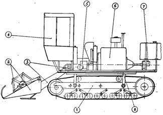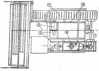 УЭС-РГ состоит (см. рисунок) из следующих агрегатов, узлов и систем: гусеничной тележки 1 типа ТГР-4 с резиноармированными гусеницами и торсионно-балансирной подвеской опорных катков, рамы-платформы 8 переходного устройства для расположения сменного (жатка валковая 2 и адаптер 3) и постоянного оборудования, смонтированного на подмоторной раме (моторная установка 6, объемный гидропривод ходовой части 7, объемный гидропривод технологической части 5, кабина 4 с органами управления). Установка моторная включает раму подмоторную, дизель СМД-18К, топливный бак и блок радиаторов. Элементы основной гидравлической системы и электрооборудования УЭС-РГ заимствованы с силосоуборочного комбайна КСГ-3.2А. Независимые объемные гидроприводы ГСТ-90 служат для передачи мощности от двигателя к ходовой части с бесступенчатым регулированием скорости движения, силы тяги и к рабочим органам жатки с плавным регулированием режимов ее работы с рабочего места механизатора. Такое регулирование режимов работы самоходной жатки позволяет изменять частоту колебаний ножа режущего аппарата и частоту вращения мотовила в зависимости от поступательной скорости движения ЖВС при номинальном режиме работы дизеля, что обуславливает увеличение производительности валкового агрегата. Теплообменники и масляные резервуары, входящие в состав гидрообъемных приводов, заимствованы с серийных сельскохозяйственных тракторов и самоходных сельскохозяйственных машин, остальные их элементы входят в комплект поставки ГСТ-90. Передача мощности на ходовую и технологическую части осуществляется от коленвала дизеля соответственно со стороны муфты сцепления и вентилятора на соответствующие гидронасосы НП-90 посредством карданов. Адаптер служит для навески и привода жатки и включает наклонную камеру серийного комбайна «Енисей-1200», шарнирно соединенную с рамкой сварной конструкции, монтируемой на раме-платформе. Передача крутящего момента от гидромотора МП-90 объемного гидропривода на рабочие органы жатки осуществляется посредством привода на рамке и штатной цепной передачи наклонной камеры. Привод, смонтированный на рамке, включает гидромотор, соединительную муфту, вал привода с подшипниками опоры и шкив клиноременной передачи на шкив наклонной камеры с натяжным роликом. |