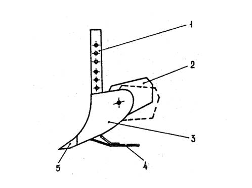 Описание Результат выполнения конструкторской работы. Рабочий орган состоит из стойки 1 (см.рисунок), к которой прикреплены сменный наральник 5, двухсторонний отвал 3 с раздвижными крыльями 2 и опорная лыжа 4. При работе почва, подрезанная наральником, поднимается по рабочей поверхности отвала, рыхлится и крыльями подгребается к рядку растений. Пазы, предусмотренные на крыльях, позволяют изменить положение последних по высоте, и, тем самым, регулировать высоту гребня почвы, образуемого рабочим органом. Опорная лыжа обеспечивает устойчивый ход рабочего органа при заданной глубине обработки почвы. Два данных рабочих органа совместно с универсальной навеской НУ-1 агрегатируются с колесными пешеходно-ездовыми мотоблоками тягового класса 0,1. Рабочие органы стойками присоединяются к боковым держателям навески и фиксируются в зависимости от глубины обработки почвы на требуемой высоте стопорными винтами.