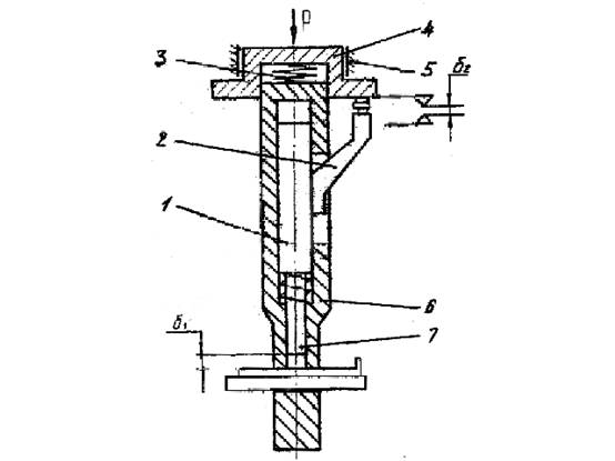 Описание Результат выполнения конструкторской разработки. Устройство включает в себя ползун 1 (см.рисунок), упор 2, пружины 3, стакан 4, направляющие 5, электрод 6. Привод сжатия передает усилие Р на стакан, который перемещается в направляющих и опускает электрод до соприкосновения с соединяемыми деталями. При дальнейшем перемещении стакан деформирует предварительно сжатую тарированную пружину, которая передает усилие на электрод. Электрод, соприкасаясь с деталями, останавливается. Стакан под действием привода сжатия продолжает опускаться, сжимая пружину, и через упор воздействует на ползун с закрепленным в нем клеймом, перемещая их относительно электрода. При перемещении клейма в полости электрода на величину