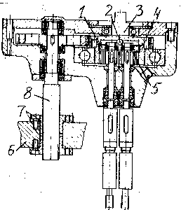 Описание Результат выполнения научно-исследовательской работы. Многошпиндельная головка с приспособлением устанавливается на станке мод. 2А135. Через хвостовик, специальный фланец крепят ее со шпинделем станка. Приспособление устанавливается и крепится по пазам стола станка. Обрабатываемая деталь устанавливается и крепится в приспособлении с помощью пневматического цилиндра. Для более надежной работы зацепления и увеличения жесткости шпинделей на их верхнюю часть установлены подшипники 5 (см. рисунок) с обоймой 1. Чтобы обойма не сходила с подшипников, установлен шарик 2 между обоймой и валом-шестерней 3. Рабочая подача головки осуществляется ходовым винтом 8 с трапецеидальной шлифовальной резьбой. При вращении он ввертывается в резьбовые втулки 7, которые закрепляют на кронштейне 8, установленном на «ласточкином хвосте» станины станка. Разрезные втулки служат для компенсации износа резьбы на сопрягаемых деталях. Скорость резания и подача достигается передаточным отношением (кинематикой) головки.