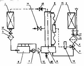 Установка содержит баки для топлива 1 (см. рис.) и воды 2, фильтры топлива 3 и воды 4, электромагнитный клапан 5, многосекционный насос высокого давления 6 с электроприводом 7, диспергатор в виде реактора 8 для приготовления водотопливной эмульсии. Внутренняя полость реактора 8 с одной стороны соединена с колонкой 9, а через проходной невозвратный клапан 10 соединена с линией перепуска эмульсии в топливный бак, с другой - сообщена с распылителями форсунок 11, установленных тангенциально к средней окружности внутренней камеры реактора 8 и соединенных трубопроводами высокого давления с многосекционным насосом высокого давления 6, полость низкого давления которого через проходной клапан 12 и фильтр топлива 3 соединена с баком 1. В нижнюю часть реактора 8 через жиклер (на рис. не показан), через проходной клапан 13, фильтр воды 4 и регулируемый электромагнитный клапан 5 подается вода из бака 2. Разборная колонка 9 через проходной клапан 14 соединена с системой питания двигателя, а с другой стороны сообщена с первичным преобразователем плотности 15, соединенным электрической связью с вторичным преобразователем плотности 16, управляющим электромагнитным клапаном 5. Возможно подключение установки к стационарной водопроводной сети через клапан 17. В нижней части реактора установлен спускной клапан 18. |