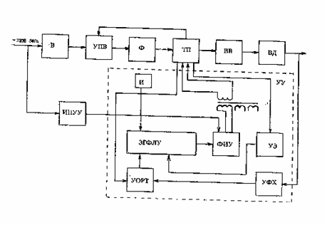 Описание Результат выполнения конструкторской разработки. В состав сварочного аппарата постоянного тока входят: входной выпрямитель В( см.схему); устройство плавного включения УПВ; входной фильтр Ф; транзисторный преобразователь ТП; выходной выпрямитель ВВ; устройство управления УУ; источник питания устройства управления ИПУУ; индикатор включения и исправности И; задающий генератор и формирователь логики управления ЗГФЛУ; триггер ТГ; формирователь импульсов управления ФИУ; выходной дроссель ВД; устройство ограничения и регулирования тока УОРТ; устройство защиты от перегрева транзисторов преобразователя УЗ; устройство формирования"жесткой"выходной вольтамперной характеристикиУФХ. Конструктивно аппарат выполнен в виде переносного моноблока. На передней панели расположены индикатор срабатывания тепловой защиты и индикатор, сигнализирующий о включении и исправном состоянии аппарата. В нижней части передней панели находится колодка для присоединения сварочных кабелей. На задней панели размещены тумблер включения аппарата и потенциометр регулирования сварочного тока. В основу работу прибора положен метод высокочастотного преобразования электрической энергии. Напряжение сети выпрямляется входным выпрямителем, сглаживается входным фильтром и поступает на вход ТП. Между входным выпрямителем и фильтром включено УПВ, обеспечивающее плавный заряд конденсаторов входного фильтра. ТП совместно с трансформатором ФИУ представляет собой автогенератор, обеспечиващий преобразование постоянного напряжения с выхода Ф в переменное импульсное. Питание УУ обеспечивает источник питания. Транзисторный преобразователь содержит дроссель в цепи переменного тока, соединенный последовательно с силовым трансформатором.Это обеспечивает крутопадающую выходную характеристику. Импульсное напряжение ТП выпрямляется выходным выпрямителем и через выходной дроссель поступает на выходные клеммы аппарата. Управление работой ТП, защиту от перегрузок по току и регулирование сварочного тока и выходного напряжения осуществляет УУ. Индикатор исправности указывает на включенное состояние аппарата, его исправность и готовность к работе. Логику работу ТП определяют задающий генератор и формирователь логики управления. УОРТ, воздействуя на ЗГФЛУ, обеспечивает регулирование коллекторного тока транзисторов ТП для получения заданного тока дуги. УЗ обеспечивает выключение транзисторов ТП при их перегреве. Сварка производится штучными плавкими электродами любой марки диаметром 1-3,0 мм при дуге, образованной постоянным током, регулируемым в пределах от 30 до 120 А с панели управления аппарата.