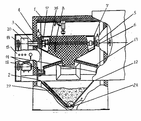 Описание 025-0 2 Результат выполнения конструкторской разработки. Установка для нанесения газотермического покрытия содержит теплозвукоизоляционную камеру 1 (см.рисунок), смонтированную на станине 2, механизм вращения шпинделя 3 с планшайбой 4, имеющих с центром пиноли 5 общую горизонтальную ось, решетчатый защитный кожух 6 с крышкой 7, дробеструйный пистолет 8, пневмоцилиндр 9, соединенный с держателем пистолета 10 (например, плазмотрона) и установленный в верхней части камеры на направляющей балке 11, конусообразный бункер кондиционного абразива 12 с крышкой 13, контейнеры для некондиционного абразива 14, пульт управления 15, на котором установлен пневматический кран управления 16, дверь камеры 17. Механизм вращения шпинделя состоит из электродвигателя 18, ременной передачи 19, редуктора 20. Решетчатый защитный кожух с крышкой выполнены из металлической сетки с диаметром ячеек 1,5 мм и в местах контакта с планшайбой и центром пиноли и снабжены войлочными уплотнениями 21. Решетчатый защитный кожух приварен к крышке бункера. Пневмоцилиндр состоит из цилиндра 22 и размещенного в нем прецизионного поршня 23, опирающегося на пружину 24, жесткость которой регулируется гайкой 25. К днищу поршня крепится держатель плазмотрона, фиксирующийся контргайкой 26. Конусообразный бункер содержит заборный рукав 27 и дополнительный напорный рукав 28. Пневматический кран управления состоит из воздухораспределительного вала, в котором выполнены осевые и радиальные отверстия, и цилиндра с радиальными отверстиями"а"и"б". Пневматический кран управления соединен транспортными рукавами с источником сжатого воздуха, пневмоцилиндром и дробеструйным пистолетом. Последний также соединен транспортным рукавом с заборным рукавом. Для обеспечения отсоса из камеры продуктов очистки и газов установка снабжена вентиляционным рукавом. Для предотвращения попадания абразива за пределы кожуха при дробеструйной обработке деталей крышка кожуха снабжена металлокордом . Установка работает следующим образом. Деталь, подлежащая восстановлению газотермическим напылением, помещается в защитный кожух и закрепляется в планшайбе. Крышка кожуха при этом закрывается. Сопло дробеструйного пистолета помещается в стык между крышкой кожуха и кожухом напротив обрабатываемого участка и удерживается оператором установки. Для дробеструйной обработки детали включают механизм привода шпинделя и дробеструйный пистолет. Для включения дробеструйного пистолета устанавливают пневматический кран управления в положение, при котором радиальное отверстие воздухораспределительного вала совмещается с радиальным отверстием"а"цилиндра. При этом сжатый воздух подается в транспортирующий рукав дробеструйного пистолета и напорный рукав. Сжатый воздух, проходя по каналу"а"дробеструйного пистолета, создает разряжение в канале г", вследствие чего дробь всасывается из бункера и по заборному рукаву подается в канал"г". Абразив, выходя из этого канала, попадает в канал"в". Струя сжатого воздуха, проходящая по каналу"в"разгоняет абразив и подает его на обрабатываемую деталь. Дробь, ударяясь о поверхность обрабатываемой детали, активирует ее и, отскакивая, попадает на дно решетчатого защитного кожуха. Кондиционный абразив, а также продукты очистки просеиваются через ячейки кожуха, попадают на кры