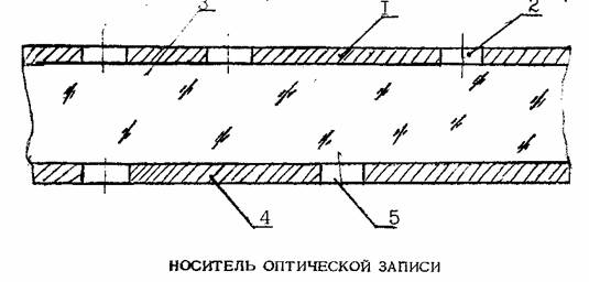 Описание Результат выполнения технологической разработки Носитель содержит металлическую пленочную информационную маску 1 (см. рисунок), имеющую отверстия 2, соответствующие записанной информации. Маска укреплена на одной из сторон пластины 3, выполненной из прозрачного материала, пропускающего луч света. Пластина содержит в своем составе частицы, имеющие показатель преломления, отличный от показателя преломления основного материала. Предполагаемый носитель оптической записи содержит так же дополнительную металлическую пленочную информационную маску 4, в которой находятся отверстия 5, соответствующие записанной информации. Дополнительную пленочную маску укрепляют на другой стороне пластины.