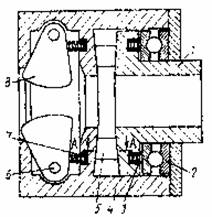 Описание Результат выполнения научно-исследовательской работы. Инструмент для бесстружечного формообразования (см. рис.) содержит корпус 1, подшипник 2, поджатый пружиной 3, крышку 4, механизм возвратно-поступательного движения, преобразующий вращательное движение шпинделя станка и содержащий, например, конические ролики 5, катящиеся по волнистым поверхностям, выполненным на корпусе 1 и крышке 4. В крышке 4 закреплены оси 6, на которых крепятся поджатые пружинами 7 сектора роликов 8. Действие инструмента заключается в следующем. Корпус устанавливают в пиноли станка, а заготовке придают вращательное движение шпинделем станка, инструмент подают на заготовку, вводят в зацепление с заготовкой и задают рабочую подачу. Заготовка при соприкосновении через сектора роликов 8 и их оси 6 придает крышке 4 вращательное движение, которое механизм преобразует в возвратно-поступательное движение крышки 4 относительно корпуса 1, например, посредством конических роликов 5, которые накатываются на вершины волнистых поверхностей корпуса 1 и крышки 4. При подаче крышки 4 на заготовку сектора роликов 8 прокатываются по заготовке и осуществляют формообразование поверхности. Затем при возврате крышки 4 в исходное положение относительно корпуса 1 сектора роликов 8 выходят из зацепления с заготовкой, благодаря выполненному на их заходной части обнижения А, и подаются пружинами 7 до исходного положения. После этого цикл повторяется.