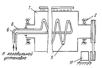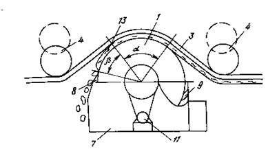 Описание Результат выполнения НИР. Общий вид устройства для очистки ленты конвейера представлен на рис.1; на рис. 2 показан радиатор охлаждения, установленный в полости очищающего барабана; на рис. 3 дана схема размещения устройства для очистки ленты конвейера. Рис. 1 Устройство содержит очищающий барабан 1, установленный на подшипниковых опорах 2 и контактирующий внешней цилиндрической поверхностью с очищаемой поверхностью ленты 3. В зоне очищающего барабана 1 установлены с возможностью вертикального перемещения прижимные ролики 4, положение которых определяет уголaохвата лентой 3 очищающего барабана 1, что позволяет изменять продолжительность контакта между ними в зависимости от температуры окружающей среды. Очищающий барабан 1 снабжен средством для охлаждения его поверхности, которое выполнено в виде радиатора 5, установленного в полости барабана 1, и холодильной установки (не показана), соединенной трубопроводом 6 с радиатором 5. Полость барабана 1 заполнена маслом. Для обеспечения работы устройства при температуре окружающей среды до + 30° нижняя часть очищающего барабана 1, не закрытая лентой 3, охвачена теплозащитным кожухом 7, на котором тангенциально к поверхности барабана 1 установлен скребок 8, удаляющий с него смерзающийся материал, и дополнительный скребок 9, подготавливающий поверхность барабана 1 к контакту с загрязненной поверхностью ленты 3. Рис. 2 Устройство установлено по ходу движения ленты 3 (рис. 3) после приводного барабана 10 и имеет индивидуальный привод 11 или приводится во вращение от приводного барабана 10 конвейера. Для предварительной очистки ленты 3 под приводным барабаном 10 размещен жесткий скребок 12. Рис. 3 Устройство работает следующим образом. После прохождения загрязненной лентой 3 скребка 12 часть налипшего материала остается на поверхности ленты и в ее углублениях. Лента 3 при дальнейшем перемещении контактирует с поверхностью очищающего барабана 1 на дугеa, где и происходит примораживание оставшегося на ленте материала к очистному барабану 1. После поворота барабана на уголbскребок 8 удаляет смерзшийся материал 13 с поверхности очищаемого барабана 1, который под собственным весом падает в следующее за конвейером транспортное устройство. Дополнительный скребок 9 удаляет с поверхности очищающего барабана 1 изморозь для обеспечения качественного контакта его поверхности с налипшим на ленту 3 материалом 13. |