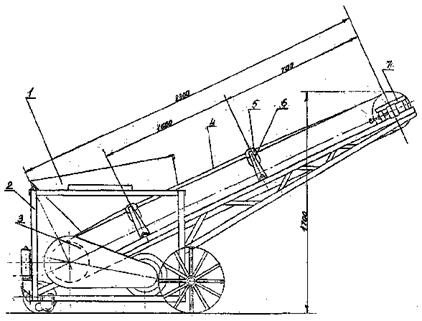 Результат выполнения конструкторской разработки. Предназначен для транспортирования формовочной смеси из бункеров-накопителей на рабочие места формовщиков. Рекомендуется для применения в литейном производстве и в строительных организациях для транспортирования цемента. Транспортер состоит из воронки 1, сварной рамы 2, ременной передачи 3, транспортерной ленты 4, Лента, установленная на опорах 6, укладывается на ролики 5 и имеет желобчатую форму. Натяжение ремня регулируется натяжным устройством 7, которое свободно передвигается по направляющим. Транспортер имеет два больших колеса диаметром 500 мм и одно малое поворотное диаметром 250 мм. Транспортер передвигается вручную. Усилие на рукоятке 10 кг. Применение транспортера повышает производительность труда и облегчает труд формовщика.