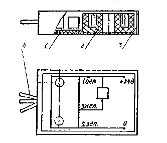 Описание к ИЛ № 42-199-00 Данная работа является результатом выполнения конструкторской разработки. Датчик имеет электрический выход, который может быть подключен к цифровой части большинства существующих схем автоматического управления. Принцип его работы основан на срыве генерации при приближении к катушке колебательного контура предмета из стали, никеля, алюминия, меди и некоторых других металлов. Конструктивно датчик (см. рисунок) выполнен в виде печатной платы 1 с размещенными на ней элементами радиосхемы и броневого сердечника, в котором находится катушка 2 контура, намотанная на фторопластовом каркасе. Плата и сердечник вставлены в корпус 3 размером 45х30х12 мм и залиты эпоксидным клеем. Для подсоединения датчика к электрической схеме из его корпуса выведены три гибких изолированных проводника 4: «0», «24В», «выход». Датчик имеет открытый коллекторный выход. Этим вызвана необходимость подключения резистора 10 кОм для проверки датчика при его неподключенном выходе. Для измерения скачков напряжения может быть использован любой прибор, дающий погрешность измерения напряжения не более±5%.