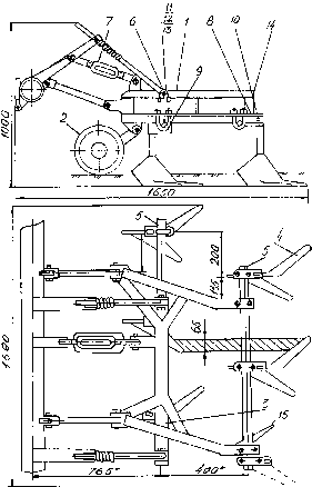 Описание Результат выполнения научно-исследовательской работы. Орудие используется для подготовки почвы к посеву, ухода за парами и пропашными культурами. В качестве рабочих органов применяются плоскорежущие, универсальные культиваторные лапы, бороны и дисковые рабочие органы. В качестве базового орудия используется лущильник ЛДГ-15. Секция плоскорежущих лап состоит из рамы 1 (см. рисунок), изготовленной из уголка. Заданное заглубление лап обеспечивается опорным колесом 2, которое регулируется по высоте. Основой рамы секции является поперечная балка 3, к которой закреплены кронштейны навески. В нижней части рамы с помощью специальных кронштейнов установлены культиваторные лапы 4 со стойками. В случае необходимости на одной из стоек может устанавливаться гребнеобразователь 15. Кронштейны крепления стоек установлены на квадратных балках 5 держателей. Необходимое заглубление поддерживается с помощью штанг с пружинами, которые воздействуют на раму секции через проушины 6. Лапы второго ряда устанавливаются на балке держателей с помощью кронштейнов держателей 8. Лапы первого ряда удерживаются на нижней части рамы с помощью балки держателей и призм 9. Стойки заднего ряда лап фиксируются в держателях винтами 10. Пружинные штанги фиксируются на раме секции скобами 13 с гайками 11 и шайбами 12. Балка держателей задних лап крепится к раме секции скобами 14. На специальной площадке производится подготовка орудия к работе и регулировка, а окончательная регулировка производится в поле. Перед началом работы проверяется техническое состояние орудия и надежность крепления всех рабочих органов. На первом проходе проверяется правильность выполненных регулировок и выполнение орудием агротребований. Орудие можно использовать покровного боронования. Для этого используют серийные бороны БЗСС-1,0 с шириной захвата 1 м, что позволяет агрегатировать 18 борон. Для подъема борон используется жесткий треугольник, одной из сторон которого является рама лущильника с приваренными в одной плоскости заводским и новым кронштейнами. Треугольник состоит из двух тяг, сваренных между собой в виде треугольника. Нижняя тяга крепится к заводскому кронштейну одним концом, другим - к поперечному брусу. Верхняя тяга крепится одним концом к новому кронштейну, другим - приваривается к нижней тяге, замыкая треугольник.