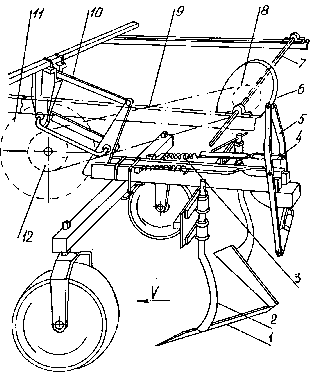 Описание Результат выполнения научно-исследовательской работы. Базовым орудием, на которое монтируется прополочная секция, служит культиватор КРН. При этом используется рама культиватора, навесное устройство, опорно-приводные колеса и прополочные секции с параллелограммной навеской. Пропалываемый рядок охватывают напольные лапы, изготовленные из левых и правых односторонних бритв, которые крепятся к стойкам несимметрично: передние концы короче задних в 1,8-2,0 раза. Обычно прополочный агрегат имеет три секции, исходя из технологии посева трехсекционной сеялкой прямоугольно-гнездовым способом. Полольные лапы закреплены на коленчатых стойках 2 (см. рисунок). Поворотные рычаги стоек соединены тягами 4 с рычагами управления 5. Воздействие на рычаги управления производится кулачком 6. Постоянное поджатие рычагов управления к кулачку осуществляется с помощью пружин растяжения. Кулачок установлен на валу 7, привод на который производится цепной передачей 9 от опорных колес 11, имеющих приводные звездочки 12. Секция закреплена на раме культиватора с помощью параллелограммной навески 10. Передаточное отношение цепной передачи обеспечивает развод лап при их подходе к растению.