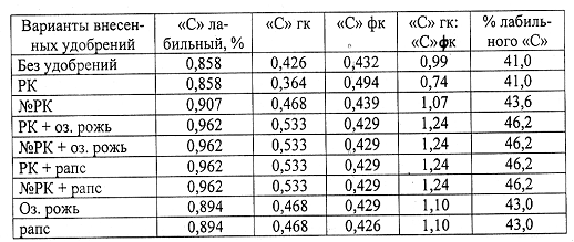 Описание Результат выполнения научно-исследовательской работы. Специалистами Псковского НИИСХ в течение 1998-2001г. проводилось изучение использования зеленых удобрений, как альтернативы применяемым в льноводстве многолетним травам. В качестве сидератов в почву запахивали озимую рожь и яровой рапс. Гумусовые вещества почв представляют собой гетерогенную систему органических веществ сложного состава и строения. Гумус составляют индивидуальные органические соединения, продукты их взаимодействия, а также органические соединения, находящиеся в форме органоминеральных образований. Гумусовые кислоты являются главными и специфическими продуктами гумификации органических остатков в почвах. Внесение в почву фитомассы ржи и рапса привело к возрастанию численности педотрофов на 17-77% по сравнению с контролями. Коэффициенты педотрофности увеличились на 6-67%, активность фермента ПФО - на 10-84%, ПО - на 21-71%. Все это указывает на наличие трансформации гумусовых веществ в почве. Определение гумуса показало (см. табл.), что его содержание в гумусовом горизонте дерново-подзолистой почвы, как и должно быть, низкое. Оно равнялось 3,623% и не превышало 4%. Внесение в почву зеленого удобрения не оказывало влияния на общее количество гумуса, но затрагивало его лабильную часть, которая увеличилась на 0,18-0,62% по сравнению с гумусовым веществом не удобренной почвы и на 0,096% по фонуnpk. Проведенная работа показала, что зеленое удобрение является надежным средством, позволяющим активизировать естественный микробный комплекс, который привел к сохранению гумуса, повышению эффективного плодородия. Таблица: Влияние сидератов на состав углерода лабильного гумуса в почве