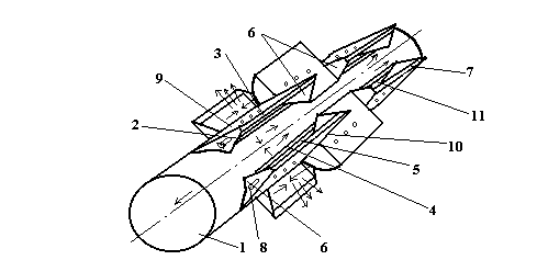 Описание Результат конструкторской разработки. Воздухораспределитель содержит воздуховод 1 со щелевым выпуском 2 и прикрепленный к нему напротив выпуска 2 с зазором 3 продольный экран. Воздухораспределитель снабжен дополнительными щелевыми выпусками 4, равномерно расположенными по поверхности воздуховода 1 продольными экранами, прикрепленными к воздуховоду 1 напротив дополнительных выпусков 4 с образованием зазоров 5, разделительными поперечными ребрами 6, установленными в зазорах 3 и 5, причем каждый экран выполнен в виде полого короба 7 с отсасывающим штуцером 8 и рядом перфорированных отверстий 9 в его наружной стенке. Короба 7 выполнены составными из сообщающихся между собой частей 10, разделительные поперечные ребра 6 установлены с торцовых сторон каждой части 10 коробов с образованием ряда лотков 11, причем лотки 11 в каждом ряду прикреплены к воздуховоду 1 в чередующемся порядке с противоположных щелевых выпусков 2 и 4 и наклонены к ним, при этом лотки 11 установлены с образованием оппозитных пар, расположенных по всей поверхности воздуховода 1 в шахматном порядке. Приточный воздух из воздуховода 1 направляется в щелевые выпуски 2 и 4, при выходе из которых встречает на своем пути лотки 11, отклоняется от своего первоначального направления и направляется в оппозитные зазоры 3 и 5, из которых с помощью разделительных поперечных ребер 6 истекает равномерными потоками навстречу друг другу. При столкновении выходящих потоков из оппозитных зазоров 3 и 5 происходит гашение их кинетической энергии, образуются высокотурбулизированные струи, которые при дальнейшем распространении быстрее гасят свою скорость при взаимодействии с окружающим воздухом. Такое использование экранов позволяет образовать струю, которая при взаимодействии с окружающим воздухом быстрее гасит свою скорость. За счет создания разрежения в коробах 7 происходит в дальнейшем смыкание и взаимодействие соседних спутных струй, гашение скорости воздушного потока при взаимодействии и образуется пространственная быстрозатухающая струя. |