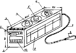 Описание Данный материал является результатом научно-технической разработки автора. Устройство (см.рисунок 1) смонтировано в пластмассовом корпусе (1) с размерами 235х70х70. Состоит из разъема вилки s ub-d (2), монтажной платы (3) с 4 лепестками, трех галетных переключателей (4)-(6), отрезка кабеля (7) с разъемом-розеткой s ub-d (8) и двух шильников (9), (10) с инструкцией по использованию устройства.