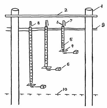 Рис. 1. 1-репер, 2- неподвижный блок, 3- полые металлические трубки, 4- пластины, 5- обсадные трубки, 6- марка, 7- измерительный шнур,8 - противовес, 9 - поверхность грунта, 10 - граница оттаивания |