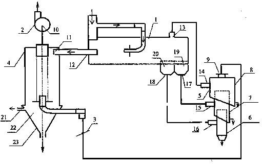 Описание Результат выполнения конструкторской разработки. Установка отвеивания и пылеулавливания содержит горизонтальный сепаратор 1 по полезной модели № 17457, вентилятор 2, заслонку 3, вихревой инерционный пылеуловитель 4 и циклонный сепаратор 5. Циклонный сепаратор выполнен в виде многоступенчатого аппарата отвеивания, включающего три последовательно расположенные по направлению снизу вверх и заглубленные одна в другую цилиндрические ступени 6, 7, 8. Верхняя ступень 8 соединена с осевым выходом 9 через заслонку 3 и вихревой инерционный пылеуловитель 4 с всасывающим входом 10 вентилятора 2. При этом тангенциальный вход 11 пылеуловителя 4 подключен к осевому патрубку 12 вывода чистого газа горизонтального сепаратора 1. Дополнительный патрубок 13 вывода чистого газа сепаратора 1 соединен с тангенциальным входом 14 верхней ступени 8 циклонного сепаратора (аппарата отвеивания) 5. Тангенциальные входы 15 и 16 двух других ступеней 7 и 6 сепаратора 5 соединены с соответствующими выходами 17 и 18 сборниками 19 и 20 фракции. Кроме этого вихревой инерционный пылеуловитель 4 содержит патрубок 21 отсоса, который соединен с полостью 22 бункера 23. Установка отвеивания и пылеулавливания работает следующим образом. Воздух, содержащий взвешенные частицы пыли, поступает в горизонтальный сепаратор 1 и после очистки по двум патрубкам 12 и 13 выводится на последующую очистку. Более крупные частицы выводятся в сборник 20, менее крупные - в сборник 19. Из патрубка 13 газ поступает на вход 14 верхней цилиндрической ступени 8 циклонного сепаратора (аппарата отвеивания) 5. За счет гравитации мелкие частицы пыли выделяются в ступени 8 аппарата. В ступень 7 и 6 аппарата отвеивания 5 поступает воздух с частицами пыли из сборников 20 и 19 горизонтального сепаратора 1. Таким образом, в аппарате отвеивания 5 происходит выделение следующих фракций: - в ступени 8 выделяется наиболее мелкая фракция пыли; - в ступени 7 - средняя; - в ступени 6 - наиболее тяжелая фракция. Очищенный в ступенях 6. 7. 8 аппарата отвеивания 5 воздух, который может содержать мелкодисперсную пыль, из осевого выхода 9 поступает через заслонку 3 в вихревой инерционный пылеуловитель 4. При этом на верхний тангенциальный вход 11 пылеуловителя 4 поступает через осевой патрубок 12 встречный воздух, прошедший очистку в горизонтальном сепараторе 1. Пройдя очистку в вихревом инерционном пылеуловителе 4, газ поступает на всасывающий вход 10 вентилятора 2 и выбрасывается в атмосферу. Заслонка 3 регулирует расход воздуха, поступающего на нижний ввод вихревого инерционного пылеуловителя 4. |